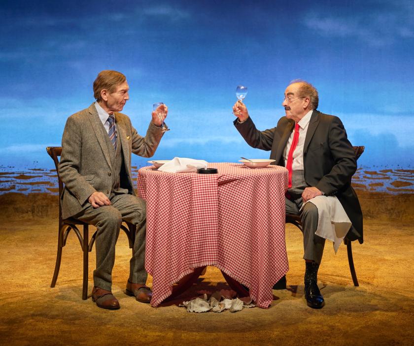 Loveday Ingram’s production handles the material with due regard for its surrealism. It’s a beautifully designed space (set by Adam Wiltshire, lighting by Paul Keogan, costumes by Joan Bergin) where invisible champagne makes a sound as it is pretend-poured and the men slurp non-existent soup. They are the only customers; even so, their steaks never arrive. As they wait, Eliot does magic tricks, even produces a rubber chicken; Groucho recites a Marianne Moore poem. They dance the Charleston and sing the music-hall songs they both love, joined by the Proprietor in a rendition of Marie Lloyd’s signature song, "The Boy in the Gallery". Eliot makes a joke about the chicken soup not being duck soup, only to have it parried and riposted as a different joke by his dining partner. Groucho in turn expresses his love of Eliot and Shakespeare. Handy-dandy, which is which?