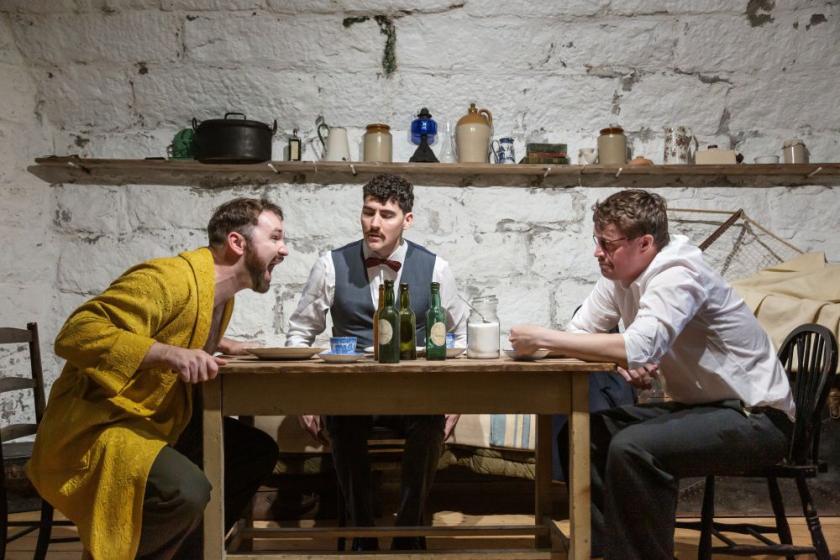 Volta wielded an augmented team for an even shorter slice of Ulysses in the same space: "Cyclops", a mere half hour's worth but richer in dramatic variety than the whole of Conor McPherson's long new play The Brightening Air, which I'd seen in London the previous week. Hourican acts in this one, brazenly contrasting with an even bigger loudmouth, the one-eyed Citizen, partly based on xenophobic nationalist Michael Cusack. Scene from 'Cyclops'Jim Roche's comic roaring turns nasty in slurring Leopold Bloom, whose Jewishness he maligns; gives another nuanced performance, by Danny Kehoe, as a quiet man goaded to confrontation (the topicality will always be there). Shannon resurfaces, blowing the dust off a big book, as a second narrator. This drama could be filled out on its return, but it's already rich indeed for its short running time (pictured above in rehearsal: Roche sans eyepatch, Flitcroft and Hourican).