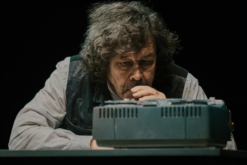 In the Stygian darkness of a bare room, a table on a low platform with a light hanging overhead starts to emerge. Then a door briefly opens at the back of the space and the figure that has entered and sat down at the table also begins to emerge. When the stage lighting goes on, this tableau out of a Bacon painting sharpens and we can properly scrutinise the man.
