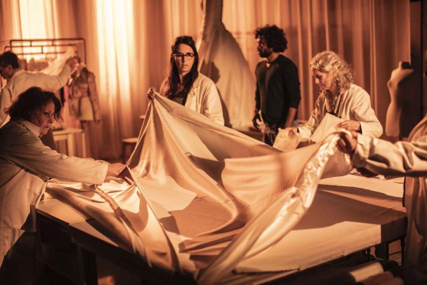 Lacrima sweeps us from a Parisian fashion workshop to the lacemakers of Alençon (a commune in Normandy) and the male embroiderers of Mumbai. In this avant-garde production a lot of the detail is documentary-worthy: we discover, for instance, that many female lacemakers went blind between the age of 30 and 35, or that it can take an entire day to make one centimetre squared of lace. But what binds the entire production together into a compelling three hours (with no interval) is the story of Marion, the workshop manager at the Beliana haute couture house in Paris. Determined, discreet and clearly married to her job, her joy when she wins the contract to oversee the making of the wedding dress is gradually eclipsed by the pressures of holding not just the other fashion workers but her own family together.The staging is almost a character in itself as it combines Alice Duchange’s vast set representing the floor of the haute couture workshop with Jérémie Scheidler’s live video feeds – shot in front of us – that whisk us around the world. Many negative stories about the fashion industry today focus on sweatshops, yet the stories of personal and physical sacrifice that we witness here are connected to individuals who see their work as a source of pride handed down through generations. One delightful running thread is a local radio presenter interviewing the lacemakers of Alençon – aged from 24 to 74 – as they joke and reminisce about their lives in the trade. Yet the sinister undertones are always there: we discover that historically lacemakers were often forced to work in silence, and many ended up suffering from apnoea which is frequently connected to heart problems.