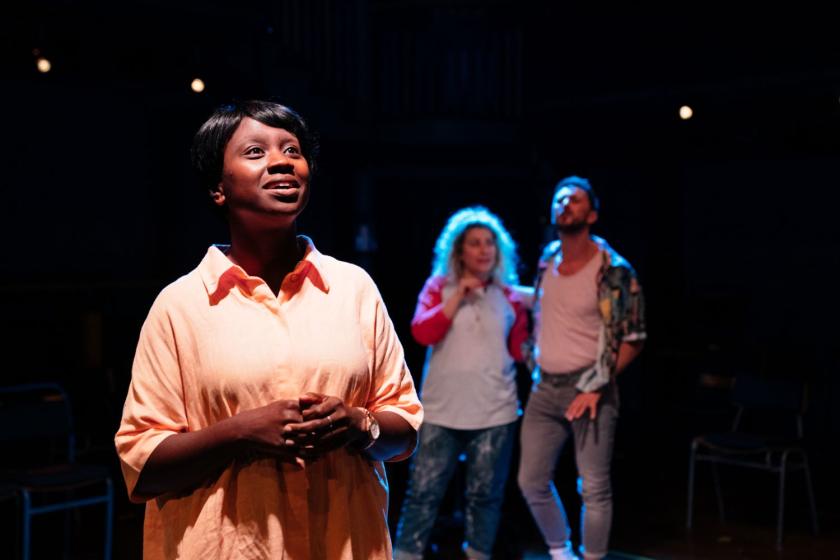 The Orange Tree has a lovely sense of community. The staff are cheery, and the seats could’ve come from any rehearsal room in London (outfitted with a little more cushioning, thankfully). Hannah Wolfe and Natalie Johnson’s set is touchingly bare except for a keyboard and four chairs with wheels, upon which the cast zoom around (literally) to great effect. It’s odd that the venue’s warm welcome is so absent onstage.
