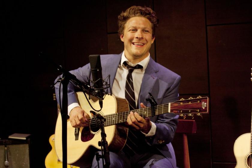 First seen earlier this summer at the Manhattan Theatre Club, where it received raves, The Lion is made to travel since all it requires are its creator-performer in fully engaged mode and the six guitars - acoustic mostly but one that is also electric - studded around the stage. (Gone for the intimacy of the St James studio is Neil Patel's New York set.) Out comes Scheuer at the start to tell us of the toy banjo his father gave this oldest of three sons when young Ben was ten, and one's first impression is of an essentially gentle sung narrative suggestive of, say, Arlo Guthrie - if, that is, Guthrie ever wore the sort of suit that at first glimpse sets Scheuer sartorially apart. Scheuer later will shed his jacket, loosen his suspenders, and roll up his sleeves by way of hinting visually at the emerging self - the person beneath his self-described "armour" of apparel - that is the show's defining topic.