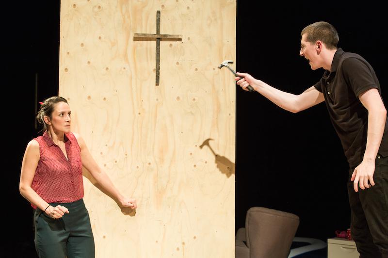 Martyr, Unicorn TheatreBenjamin’s zealotry begins with the demand that female students don more modest apparel in swimming lessons. Its not a move calculated to win him many friends, though he does pick up an “apostle”: disabled, bullied George (Farshid Rokey). Soon, Benjamin’s objecting to the teaching of evolution by donning an ape mask, stripping naked to protest a condom demonstration, claiming he can heal George, and plotting revenge against those who stand in his way.