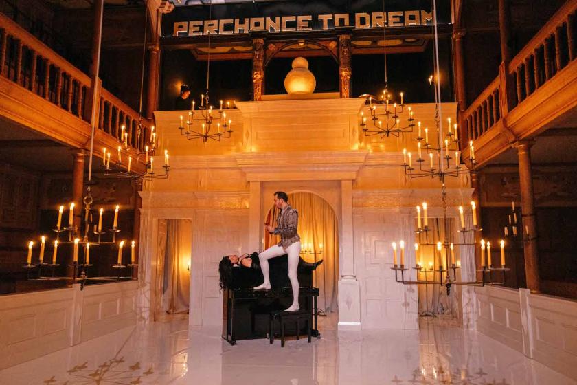 The opening speech is culled from Act V, “Now it is the time of night/That the graves all gaping wide,/Every one lets forth his sprite,” heightening the sense that his mission is more vampiric than mischievous. Lingering unease remains even as the kitchen staff erupt through the doors, setting up the table as if for an aristocratic dinner party.