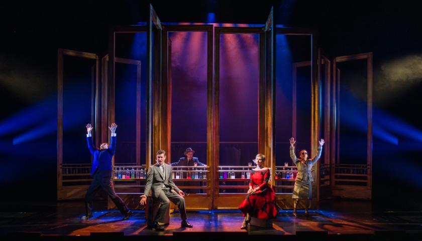 Rob Howell creates a flexible set of revolving doors that beautifully evokes a Manhattan hotel lobby and bar, but the drinks bottles stay in place for the next two hours or so. Like the narration, actors lip-synching to recordings of 40s and 50s songs is a nice novelty that soon outstays its welcome. And a few origami ears of corn may pass muster in a fringe panto, but, even given this company’s aesthetic, it feels like we’re being shortchanged.