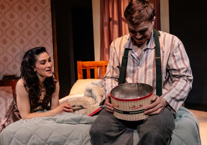 In Park Theatre’s pocket Park90 space, the teeny stage area is just about able to accommodate a double bed; behind it is a curtained window. A radio broadcast tells us we are in the midst of the Second World War and the Japanese are taking over southeast Asia. In the bed are Leonard (Barney White) and Violet (Cassie Bradley). As the slowly unfolding dialogue reveals, this is the young couple’s last night before conscripted Leonard has to leave.