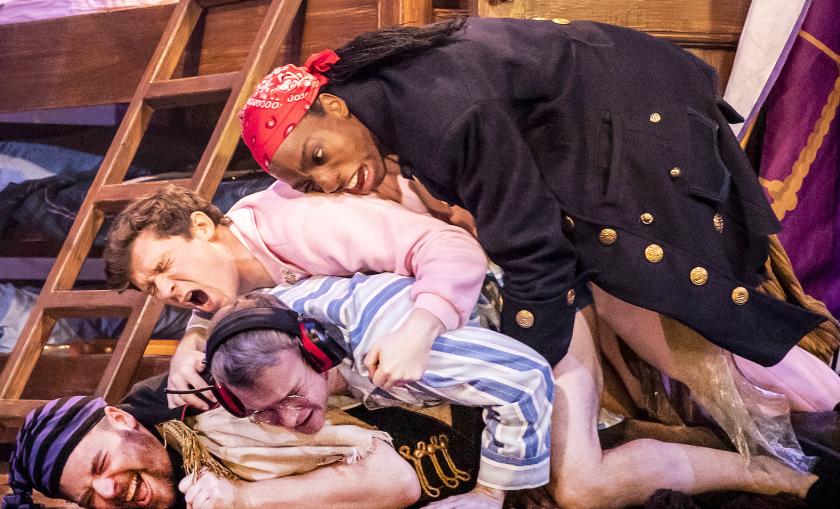 Timing is clearly paramount and, happily, faultless. The slapstick builds an impressive head of steam in the second act, leading to a dizzying set-piece where the revolve becomes a three-sided whirligig that spins the pirate ship’s tilted deck around to reveal a backstage area where two of the cast are locked in a deep snog, then on to medics treating one of the casualties of a cast/scenery encounter and back to the skew-whiff ship again. In this human blender of a set-up, all the actors apparently emerge unscathed.