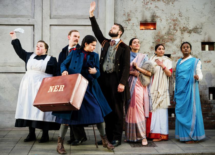 Benefitting from this minimalist approach is the depiction of the animals tamed by Martha's brother Dickon (Brydie Service). A scrunched up brown jumper becomes a little fox; a black fringed shawl, a crow, whose handler caws as she moves around; a squeaking squirrel is created out of an elegant lady's fur tippet. (Puppetry is by Laura Cubitt.) Crucially, the production draws on its Indian elements for the key character of the Robin, whose language Dickon can understand, Mary too eventually. Sharan Phull plays her as a lively young woman (the reincarnation of Colin's mother Lata, several characters suggest), who flits around singing to a sitar-like accompaniment, her hand coming to rest and held up, pulsing, to show the red oval on its palm.