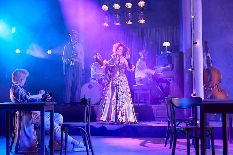 Evelyn Miller as ViolaThere are pluses and minuses to this idea. The action now takes place in a queer café, designed by Basia Bińkowska and named for the diva who owns it, Olivia, and bearing her name in gigantic neon letters. Olivia, played with terrific gusto by Anna Francolini, is the star  in both her own life and the play, her every action a performance, including outsize signals of grief. On her first entrance, trailing yards of black veil, she cradles an exotic urn containing her brother's ashes and sings the mournful "Fear no more the heat o' the sun" from Cymbeline. Francolini is a tuneful belter and holds the stage with easy pleasure, especially when she later sings a reprise of Cesario's willow cabin speech. This Olivia is hugely enjoyable to watch and listen to and readily sends herself up, but it would be difficult to believe she is capable of any true feeling for anyone else.