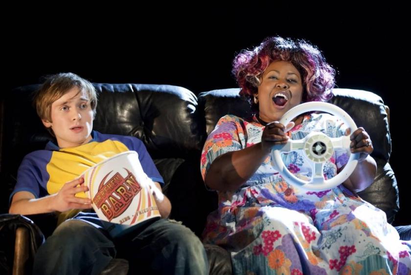 Delighting in the gun oil and fried-chicken grease stench of the white-trash South, DBC Pierre’s atmosphere clings intrusively. Rufus Norris’s production gestures toward this haphazard squalor with his deconstructed set; sofas, shopping trolleys and office chairs become cars with the simple addition of a fluorescent steering wheel or an elaborately decorated windscreen. Sets and props are mounted on wheels, sidling onto stage or manoeuvring as needed, facilitating the fractured, fast-paced chaos of Act One. Yet for all its makeshift ingenuity, there’s something a bit too clean about everything. Perhaps it’s the necessarily minimal approach, but nothing really has that sweat-stained, sauce-spilled, lived-in patina that you’d expect.