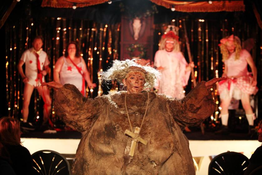 The Village Social is highly contemporary but draws its inspiration from the pagan past. The plot centres around five key myths and legends variously played out by each of the committee’s five members, while the real story is Dion’s, giving the evening’s ultimately unhinged events a moving coda. All of the stories involve a battle won by darkness over light. There is the stag-god of the Celtic otherworld, who “indulges in pleasures of the flesh 24/7”, and spear-wielding Silurian tribes who with their sheer ferocity held off the Romans in this part of the world. There is Papa Begw, the local monk denounced as a witch after developing what is comically described as an “early version of Irritable Bowel Syndrome”, and Little Missy, a girl forced to dance herself to death, her feet bound to a pair of clogs. Finally, there are Arthur and Anwen Mair, lovers whose bodies were found “impossible to separate due to the onset of rigor mortis”.