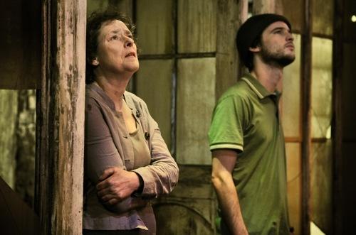 Still, when the alarm goes off, it’s a harsh and unsettling sound – if hardly the wake-up call Stephens may have intended. In the first scene, we meet 60-year-old Frieda (Linda Bassett) and her foster son Harry (Tom Sturridge), who is about to leave for a new life in Canada. It’s clear that Frieda nurtured him after events that damaged him as a child; and also that their parting is more painful and difficult for her than for him. With impressive fluidity, Lizzie Clachan’s garden-and-greenhouse set – a home under threat of demolition to make way for the airport's third runway – is replaced by the interior of a smart but sterile airport hotel room, where police officer Lisa (Jo McInnes) and art teacher Mark (Paul Ready) meet for an adulterous tryst. As she flirts with the younger, eager man, she assays a skewed sort of seduction in the form of some disturbing storytelling – an account of her heroin addiction, of the porn she engaged in to pay for her habit – and it emerges that her work has left her scarred in more ways than one. So much so, in fact, that she begs Mark to hit her. Are her tales true, or just a pornographic amalgam of the horrors she’s encountered in her job? Finally, we’re transported to a warehouse, where Sian (Amanda Hale), a well-heeled, hard-faced young woman, conducts a brutal transaction with Jonathan (Angus Wright, pictured above right), who has negotiated to purchase a young girl on the internet – probably as an adoptive daughter for himself and his wife, possibly for more sickening purposes.