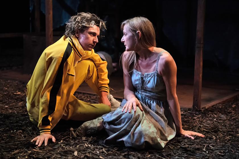 As if in some Beckettian no-place, we find ourselves watching the Mother gathering wood, building a fire, tending her Boy. At one point, the stage blazes with yellow heat. The Wolf comes and goes, his clothing changing, and as the story metamorphosizes from the wild land to the more familiar terrain of car park, playground and service station, other threats appear. Local lads abuse and bully the Woman, a service worker voices his resentment against society and a mental-hospital doctor tries to assess her condition. In this world of fractured memory and psychological pain, there are few safe places. And, when you find them, they are only temporary. All this is beautifully and hauntingly brought out in Lucy Morrison’s astonishingly powerful production, designed by Naomi Dawson.
