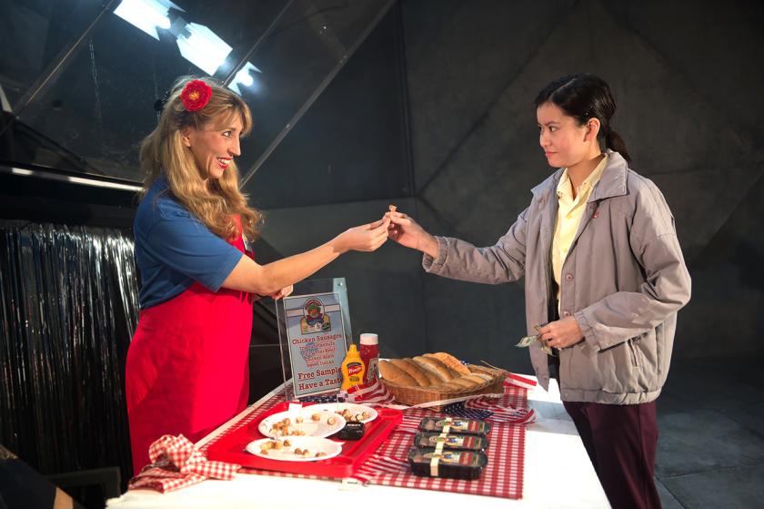 In a flash during which the space-time continuum is torn, Junhee finds herself in the United States, and struggles to make a living and then save enough money to return to North Korea to find her sister. Meanwhile, Minhee searches the country for her lost son, her lost husband and her lost life. It is a surreal and satirical evening, in which the two very different societies are both criticised. While the fast life of America is contrasted with the limitless waiting of North Korea, and endless choice with no choice, there are some lovely moments. Trees grow ears in a humorous visual metaphor of the surveillance state, and Junhee’s confusion on arriving in the Land of the Free is shown using the device of having the American characters speak gibberish, which she struggles to comprehend.