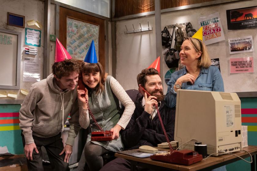 Armageddon would appear to be at the gates in Sam Steiner’s intriguing if ramshackle play, a co-production between Paines Plough and Theatre Royal, Plymouth, that has reached London while still seeming a draft or so away from achieving its full potential. Inside a Samaritans-like call centre called Brightline, pregnant work supremo Frances (Jenni Maitland, chipper to a fault) is trying to keep the mood light.