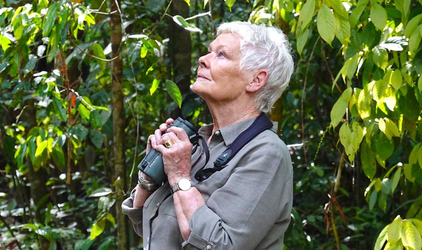 Her close friend, the conservationist David Mills, took her on a helicopter flight over a fabulous panorama of rainforest trees, some of them a thousand years old (“it’s like flying over broccoli!” she exclaimed). Zoologist Jedediah Brody pointed out a large orangutan posing obligingly in a tree, as if it had been instructed to wait there for Dame Judi or suffer the consequences. Tony Kirkham, Head of Trees at Kew Gardens, was in Borneo too, and he and the Dame were winched to the top of a 250-foot tree (pictured right) to study its luxuriant insect life, as well as flying amphibians like the Harlequin tree frog and the Draco lizard.