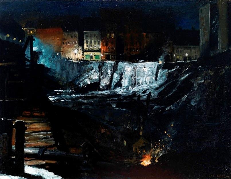 George Bellows’s Excavation at Night (1908) (main picture) is a prime example of this style, using the heightened light-dark-flickering shadows that so many European artists, from the Le Nain brothers to Wright of Derby, had explored, but in the service of a thoroughly modern subject, in this case the construction of Penn Station. Bellows’s work seethes not only with sharply angled light effects, but he also creates a sense of vertiginous, hurtling motion, where the viewer is pitched at a steep perspective, heightening the urgency.