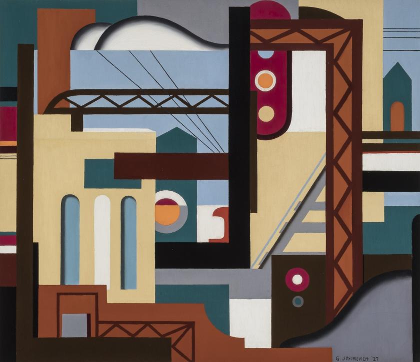 Much goes beyond observation into brilliant interpretation, into emotion and reaction poured into visual form. There is an ecstatic paean to pattern in Charles Demuth’s 1928 painting I Saw the Figure 5 in Gold (pictured right, © Metropolitan Museum of Art, New York). It is a tribute to the sight and sound of a red fire engine racing down the street as immortalised in a remarkable poem by William Carlos Williams, and as an abstract portrait of the writer, a painting in oil, gold leaf, pencil and ink that is both ferocious and beautiful in its energy. There is distillation too in abstract patterning, in Paul Kelpe’s Machinery (Abstract #2), and George Josimovich’s Illinois Central (main picture). Manufacturing, making through industrial means, was still new enough nearly a century ago to exude a rough romanticism, a sense of awed celebration as well as a subtle, worried fear.