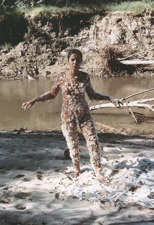 Image from Yagul, 1973, is one of many photographs taken during the Seventies that record Mendieta lying on the ground in some remote spot as though she were a corpse gradually sinking into and merging with the soil. The impulse was not an obsession with death so much as the desire to blend with nature and the elements. For her, the earth was like a mother in whom she sought refuge and, in photographs, her shrouded or mummified form appears lying on the ground, sinking into sand or mud, and being engulfed by water. She also drew the outline of her body in earth, sand and rock; blood puddles inside its contours; gunpowder fills it with smouldering ashes; flames etch the image into grass or wood (pictured above: Silueta Series, 1977) and fireworks create a sparkling effigy silhouetted against the night sky. The feelings of displacement she was trying to ameliorate originated in childhood.