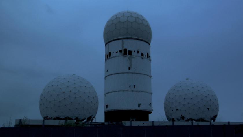 The various parts of Anri Sala’s installation are in continual dialogue with each other, and the uniting factor is sound. The ghostly drumsticks are activated by low frequency vibrations emanating from the video Answer Me (2008) being projected in the central gallery. The video was shot inside the geodesic domes of the Teufelsberg Intelligence Station in West Berlin, designed by Buckminster Fuller during the Cold War for surveillance purposes.