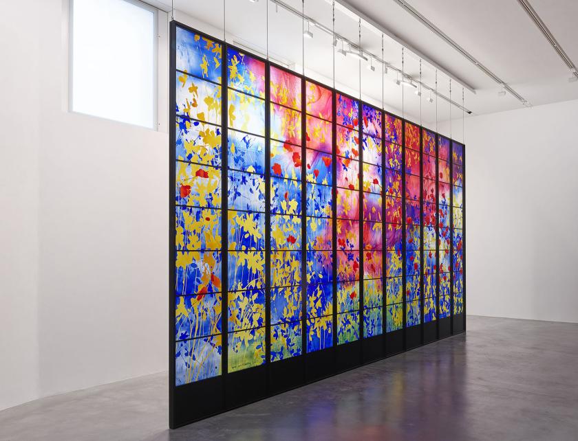 At the heart of this marvellously curated exhibition lies a richly paradoxical and deeply stirring juxtaposition of Eros and Thanatos, the energies of life and death, creation and destruction. Brian Clarke, whose passion for the way in which light animates colour and fills space with something intangible and yet very real, began in an adolescent epiphany (as he calls it) – when he was first confronted and filled with awe by the sight and tangible presence of the glass in York Minster. In spite of having being at one time into punk aesthetics, a great deal of playfulness and a refusal to play the game, he’s always been a profoundly spiritual artist. Not because he professes a mission or shouts about his beliefs, but in a way that manifests the creative spirit that animates all the greatest artistic work. Although he works in the context of religious architecture, he isn’t in any way affiliated, only in tune with the essence of spiritual quest.