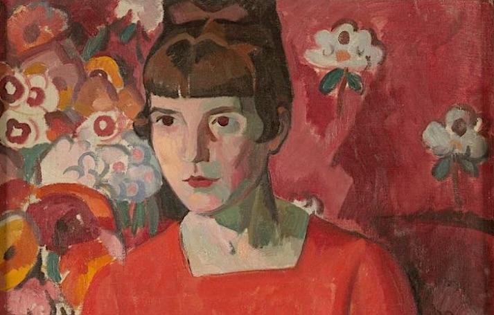 In Rice’s portrait of Mansfield, the contrast between the colourful flower-filled background and Mansfield’s "brick red" dress, and the serious, intense expression on her face is striking. This is no warm, cuddly representation of the writer, rather a representation that underlines Katherine’s seriousness. At the same time, the light streaming in from the left leaves the right side of her face highly illuminated with the left side in relative darkness, the shadow, together with the yellow on her cheek, signalling her recently-diagnosed TB. The floral background to the portrait is not easy to read – not least the flowers themselves. Those to the left of the sitter are a mixture in a vase, whereas those to the right are decoration on wallpaper or curtain material. Mansfield sits in an armchair, her hands, crossed on her lap and holding a book, all indicated by mere slabs of paint.