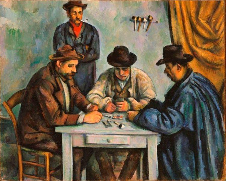 But though you might call Cézanne’s Card Players genre paintings, these are most unlike the animated tavern scenes depicted in 17th-century Dutch and French painting. They are remarkable for their stillness, for their sense of timelessness and simple but imposing monumentality. They certainly epitomise Cezanne’s aim to produce “something solid and endurable, like the art of the museums”.