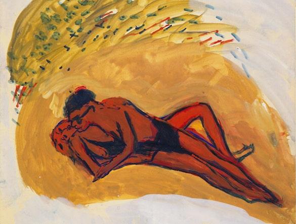 Nevertheless, the final painting of Life? or Theatre? (pictured above) is characterised by self-sufficiency. Salomon sits alone on a beach, her back to the viewer, beginning the very work that the gouache concludes. The sky is a deep, enduring blue. The artist is absorbed in her work. In the paintings directly preceding she claims to have realised she “did not have to kill herself like her ancestors.” Her justifications for living are still predicated on Daberlohn’s theories, not yet her own, but the humour, vision and self-reflection which characterise the work suggest a sense of purpose, confidence and great artistic conviction. What the future would have held is impossible to say, however. Six months later, aged 26 and five months pregnant, she was murdered upon arrival in Auschwitz. Her marvellous work now stands testament not just to her talent and resilience, but also her betrayal. Not by fate, but by history.