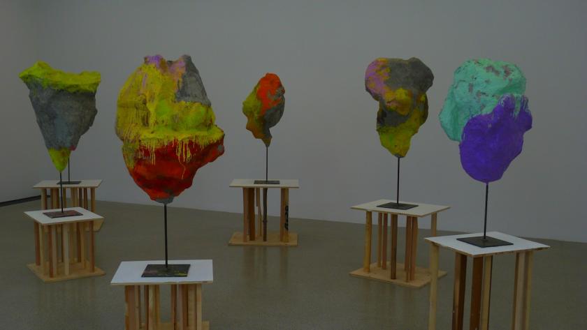 But don’t let the intellectual framework blind you to the vivid appeal of many of West’s sculptures. His candy-coloured palette clashes with his use of rough plaster and the contrast provides this show with many highlights. Chief among these is Parrhesia, 2012 (main picture), a group of seven misshapen forms which sit atop plinths and read like a group of heads in conversation. “Parrhesia” is a Greek concept which calls for us all to speak our minds at all times, regardless of the risk.