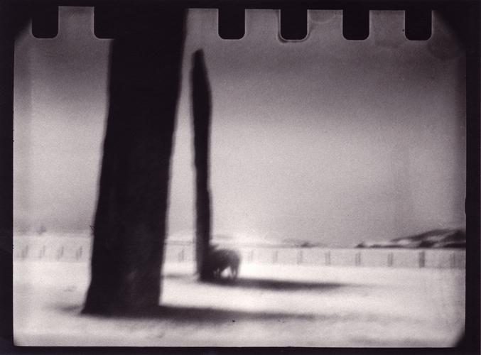 The neo-old-timers have returned to a hands-on, craft-like relationship with the finished image, and a direct involvement with science over technology. They grapple with the physics of lighting, concoct recipes for printing, and many are present at that alchemical moment when an image rises magically from a tray of chemicals. Their work is the cheapest. Neil Bacon’s mysteriously beautiful series, Monuments, was made with a £12, plastic, 35mm pin-hole camera. He describes the results as "a travel journey through dream space", a familiar, mysterious environment for photographers, though not so many here. His setting is a flat, snow-covered, nocturnal landscape leading the eye past a monumental tree trunk and stick-like tree sheltering a sheep, to white fields on a glowing horizon. The jagged paper at the top of the frame is part of the plan, Bacon explains: “I have left in many of the 'mistakes’ inherent in these techniques as evidence of the maker’s hand, the tools I used, and the slippery nature of photographic ‘reality'.”