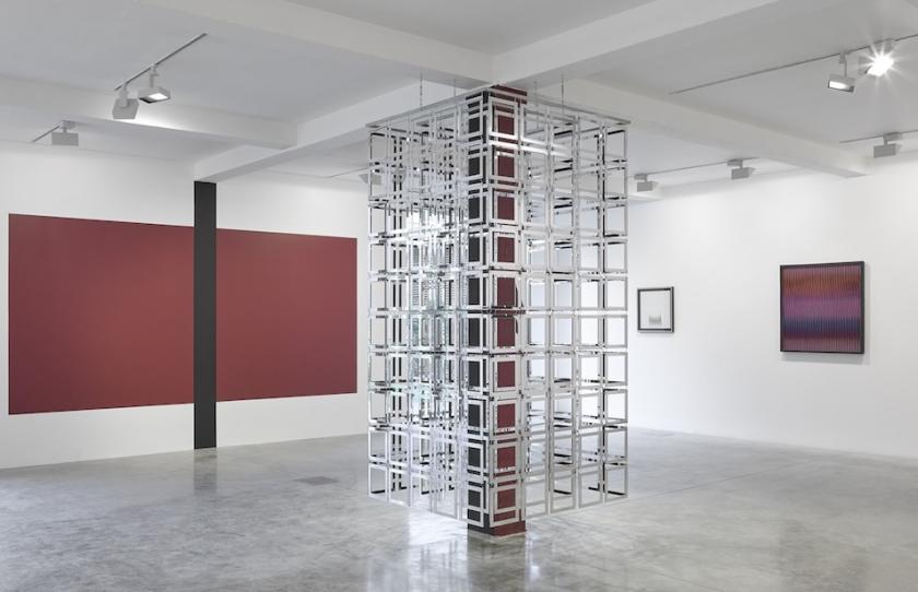 Such tensions resonate throughout this show and culminate in a column of double-sided mirrors dominating the centre of the second room, continuing up through the floor, treelike, to the upper gallery. Made by Carla Arocha & Stéphane Schraenen (1961– and 1971–), the piece simultaneously frames and reflects, partially and imperfectly, the red, yellow and blue of surrounding works (Main picture). As you move around it the view changes like a kaleidoscope, the space condensing and flattening to generate an interplay of presence and absence, positive and negative, real and unreal.