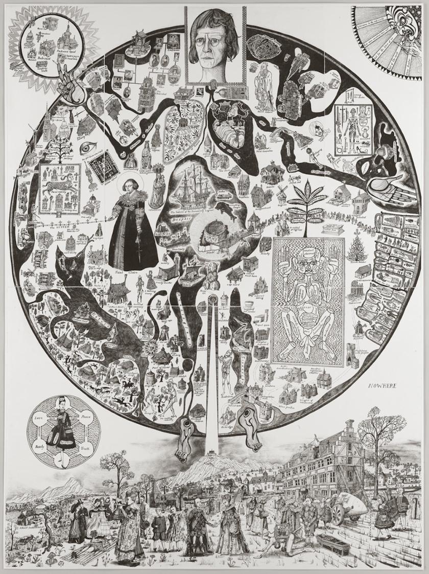Take another tapestry featuring lists: in Map of Truths and Beliefs, 2011, he gives us a Britain of fish ‘n’ chip shops, Eric and Ernie, the Free Press, Tom Jones, Shakespeare, the FA Cup, and all the other things that, in the words of The Sun, “make Britain great”. It’s all kind of tongue-in-cheek, but it’s also not. I mean, what happened to The Black and White Minstrel show, the National Front, Enoch Powell and “Paki-bashing”, all also redolant of an era the work leans towards – or doesn’t any of that quite fit the bill? Let’s all dance round the maypole, why don’t we.