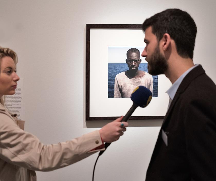 The winner is César Dezfuli’s stunning portrait of Amadou Sumaila, a 16-year-old from Mali rescued in the Mediterranean, a picture which hits us with the subject’s strength and fear (main picture, with the photographer). Second place goes to Abbie Traylor-Smith for Fleeing Mosul, an image of an anonymous young woman photographed through the mud-streaked window of a bus reflecting the shock and bewilderment of life after ISIS (pictured above). In third place is something other – Maija Tammi’s image One of Them is a Human #1. It is a picture of Erica, an advanced robot able to express emotions via dozens of pneumatic actuators embedded beneath her silicone skin – she looks rather knowing, as well she might (pictured below). Important people are in the show – Barack Obama being punched on the nose by a child, Hillary Clinton showing raw emotion, David Cameron checking his appearance in the mirror and Donald Trump, instantly recognisable from the rear.