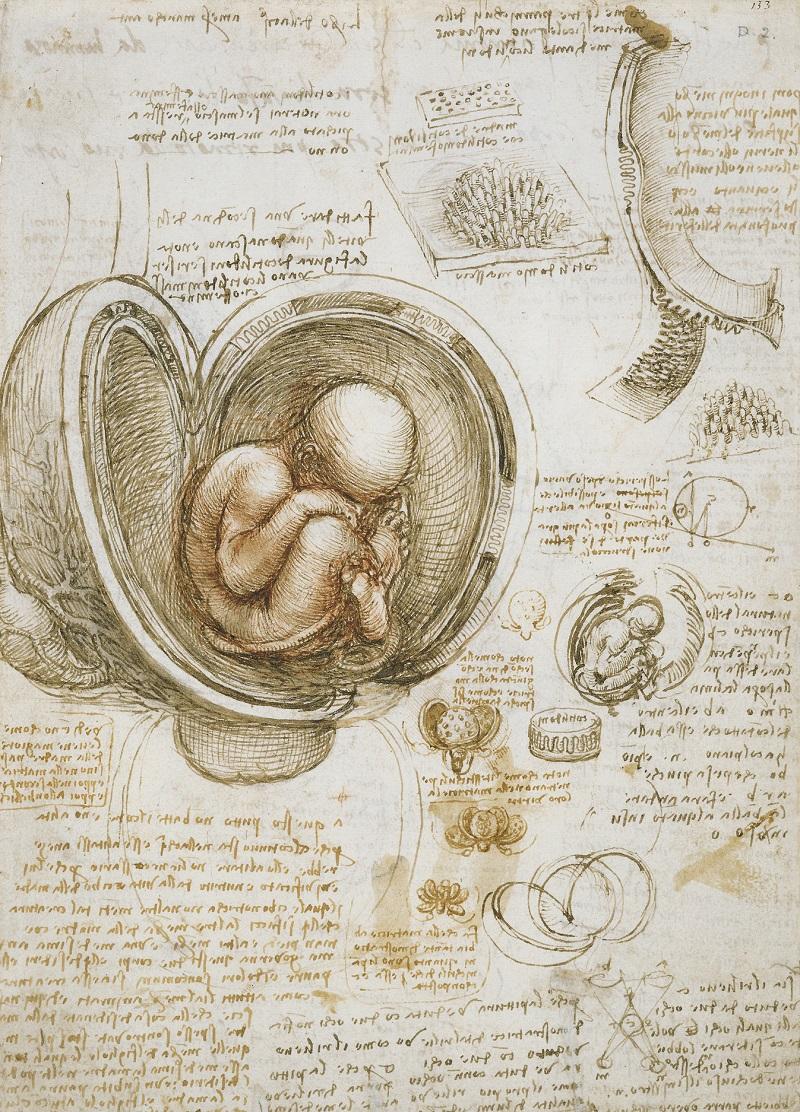 Meticulous studies in metalpoint and chalk show the care with which Leonardo prepared his artistic projects, but the drawings that relate directly to paintings and sculptures are relatively few. The bulk are concerned with everyday thoughts and observations, from designs for items of weaponry to comical, grotesque heads, studies of plants and geological formations, and most famously, his anatomical studies (Main picture: The Fetus in the Womb, c.1511).