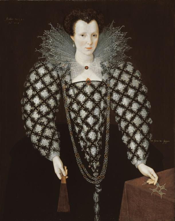 Instead, the exhibition starts with a delightful portrait of Lady Harington (1592) by Marcus Gheeraerts, court painter to Elizabeth I. Dressed in a gorgeous gown with a long, triangular bodice and padded sleeves decorated with an elaborate pattern in black and white, she looks extremely diffident. Her heart-shaped face is framed by a lace collar as fine as gossamer but as explosive as fireworks.