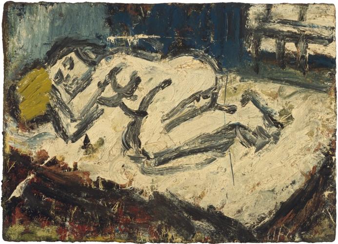 We are introduced first through a sharp selection of portraits, from models and friends. Frank Auerbach’s Reclining Figure, 1972, is a cascade of yellow, pink and white oblongs, abstract and yet utterly, alarmingly convincing as a study from the model. The sharp, tingling colour is set against a sombre background, the paint almost crusted. Leon Kossoff’s Nude (Autumn Morning), 1971 (see main image), is his characteristic concatenation of blacks and greys, thickly painted, from which the figure convincingly emerges; now you see her, now you don’t. These bold outlines and sober colours do somehow magically describe human flesh. Lucian Freud gives us Lady Anne Tree, circa 1950, an incandescent study of a woman’s face, her eyes half closed, looking down. Her pose is ineffably demure, almost elusive: a disguise, perhaps, a meditation on the impossibility of knowing another person. And here too is Freud’s tiny miniature of a wilfully distorted Girl on a Turkish Sofa, with a huge bottom and huge feet thrust towards us, so oddly vital and perverse.