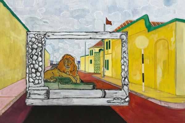 Untitled (Wheelchair), 2019 © Peter Doig. All Rights Reserved, DACS 2019. Courtesy Michael Werner Gallery, New York and London.Should we find Doig’s aesthetic mastery disturbing? His command of colour might be a conscious distraction, perhaps we should beware. There’s also the question of side shows and subplots. In his paintings there's often someone on a corner, hiding or doubling or having something happen to them. These figures slide out of sight, evocative but chary of scrutiny. In Untitled, (Wheelchair), 2019, a dramatically foreshortened man in a patterned shirt looks ready to walk through the red railings separating the road from a blossoming orchard. Across the road, a police officer has pulled in to detain a man standing splayed against the wall. Yet, can we be sure? Distance leaves the rendition indistinct and half of the scene is obscured. In the foreground, the policeman is doubled, except this time he helps an amputee across the road. In Lion in the Road (Sailors), 2019 (pictured top) a lion comfortably seated on a book-like plinth cuts seductively green eyes across a prominent stone frame stationed in the middle of the road. A vision? Perhaps no more so than the man bisected by the lamp-post who walks along the actual pavement. The lion knows where it is, even if its viewers don’t.