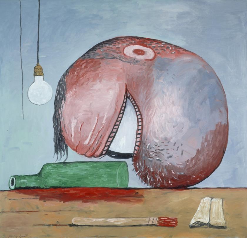 Light bulbs, Klansmen, shoes, clocks, books, potato-headed artists, dog-ends from cigarettes smoked through the night in creative meditation. There is so much of the poetry of creation and impotence in Guston’s work. Creation and atrophy. The comic and the tragic. Banality and high art. Like Guston’s 1978 painting The Line, which depicts an aged hand descending from a cloud and making a thick mark with a piece of charcoal held between two figures – a riff, of course, on Michelangelo’s hand of God – Head and Bottle denotes the single all-seeing eye of the creator. It looks. We look. Watch out, it will follow you around the room and out the door. Guston’s work gets inside your head.