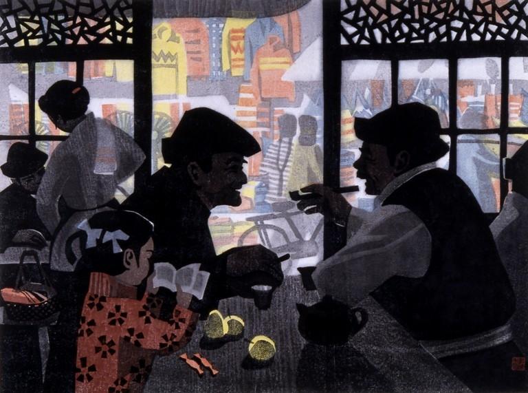 Heroic images of workers and peasants illustrated in a social realist style are not a particular highpoint in this exhibition, but later, more sensitive illustrations, such as Chen Yiming’s 1981 print Happiness (pictured above right), which depicts the weather-beaten face of a peasant while he is enjoying his pipe, are of a different order. This image was considered a milestone in Chinese contemporary art: the black and white contrasts, as well as the rough carving of the block to suggest the worn out features of the peasant, make it an extremely evocative image. Meanwhile, prints of everyday life such as Wu Jide's 1984 Chatting Over Tea (main picture top) evoke as well as idealise the life of the ordinary citizen.