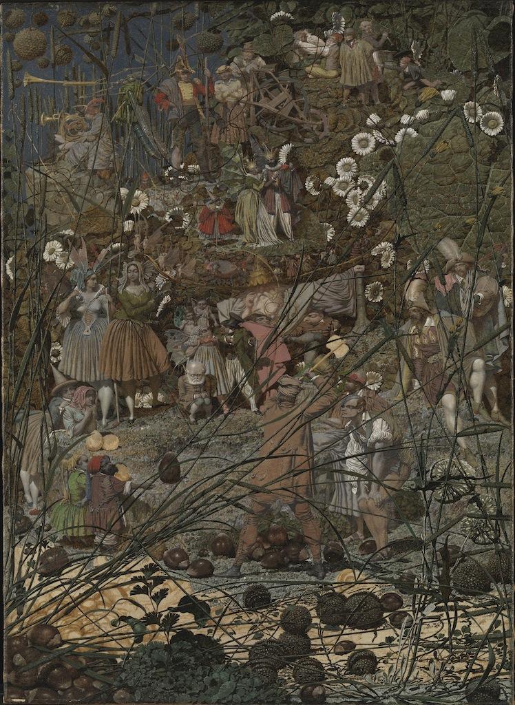 As you can imagine, we are here a long way from Disney’s Tinker Bell. Dadd’s cast emerge from the undergrowth in multitudes: troll-like, satyr-like, centaur-like, but more often than not in perfect, if tiny, human form. Most of their faces are wan grey, as if in imitation of early photographs. And the viewer has to peer through blades of grass and past dock leaves to take in the processional action; the artist is such a fine miniaturist that to-scale daisies and snowdrops have larger heads than his figures.