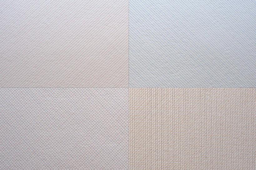 The works range from the bold to the barely perceptible. A work at the exhibition’s entrance, for instance, is so quiet that it’s easy to walk past it without noticing. Featuring thick lines in white, on a white wall, the lines are differentiated only in the way the paint reflects light. Once you see it, you find a subtly changing work.