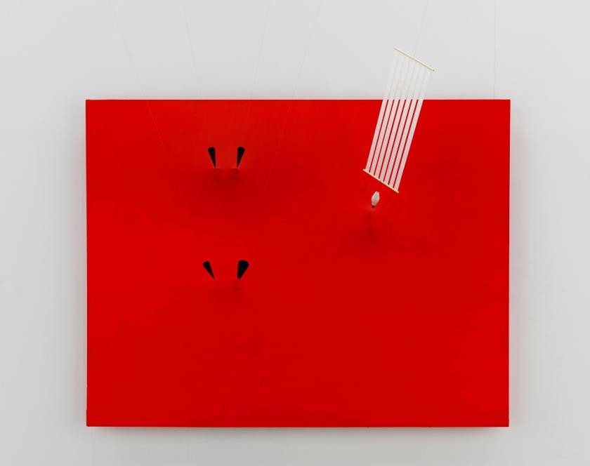 In his hands, painting too becomes a contested area: canvases bulge as magnets on either side of a painted surface hold a series of abstract objects aloft, as in Magnetic Wall 9 (Red), 1961 (Main picture). It’s a work that both defies and affirms the limitations of two dimensional representation, as objects floating in front of the canvas animate the picture plane, and declare it redundant.