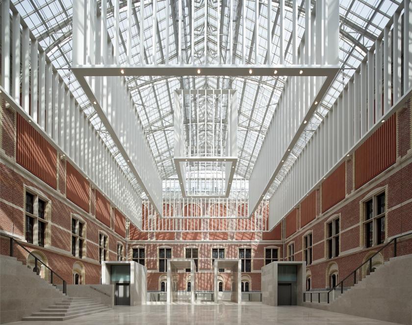 At the heart of the building is the vast glass-ceilinged atrium: airy, bright and very modern. So it’s easy to forget what a spectacular Medievalist fantasy the building actually is, at least when you first step inside. It was designed in the 1880s by Pierre Cuypers, who also built Amsterdam Central Station. In the old days, you’d almost expect a train to come rushing through its central courtyard. But thankfully, this isn’t the wrecking Sixties, so a respect for the integrity of the original design has ensured that Cuypers’ Gothic decorative scheme has been retained by architects Cruz and Ortiz. The huge stained glass windows (pictured below) and the walls of the corridors that have been decorated with figures in Medieval garb emerge in all their spruced-up glory.