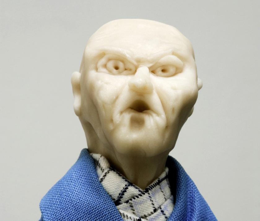 A room full of patinated bronze heads on steel shelves mocks those neoclassical interiors where contemporary worthies, or sages from the past, divine or otherwise, are ranged in procession to look down on the mortals below. Entitled Jerks, they appear like parodied figures of authority. Innocenti is a series of photographs of whitish heads, their features pushed every which way, but their hollowed-out eyes the conventional outlines of classical sculpture. The most elaborate faces look as though they are made of silly putty, or melting wax, their facial features either on the point of dissolution or of hardening (Medardo Rosso, the underated Italian symbolist comes to mind). Sometimes they remind the spectator of faces which have suffered horrific burns or assaults of other kinds.