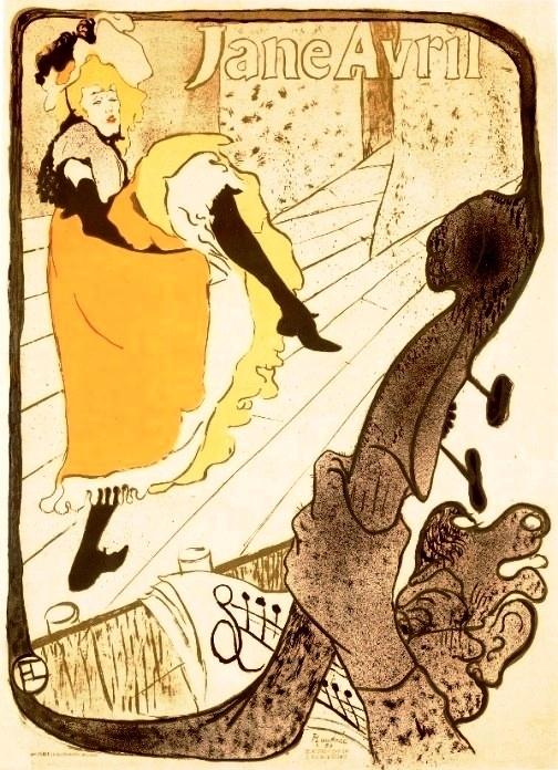 In Divan Japonais (pictured above left), 1893, the first work in which he portrayed her, all is sinuous lines and curves. Seated in the audience, Avril’s lithe figure is dressed strikingly in black. Lautrec's palette is again a reduction to three main colours, black, yellow and grey, with only a reddish-orange for Avril’s hair, and for her thinly pursed lips. But what incredible compositional flair: the arms of the two double-basses echo the raised arms of the conductor, their line following an upward curve and all framed within the elegant curve of Avril’s chest and extended arm.