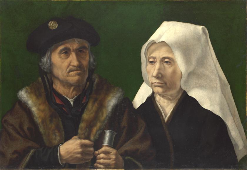 By comparison with the Duchess, he is unremarkable – elderly and dull. So what is it that makes her so endlessly fascinating? Her extraordinary features are all awry; her big ears, snub nose, unusually long upper lip, heavy jaw and turkey neck verge on deformity, yet her brown eyes seem filled with hope and longing. When compared with the woman in Jan Gossaert’s portrait of An Elderly Couple 1520 (main picture), also on show, it becomes clear just how far she deviates from the norm and how brazen her character must have seemed at the time.